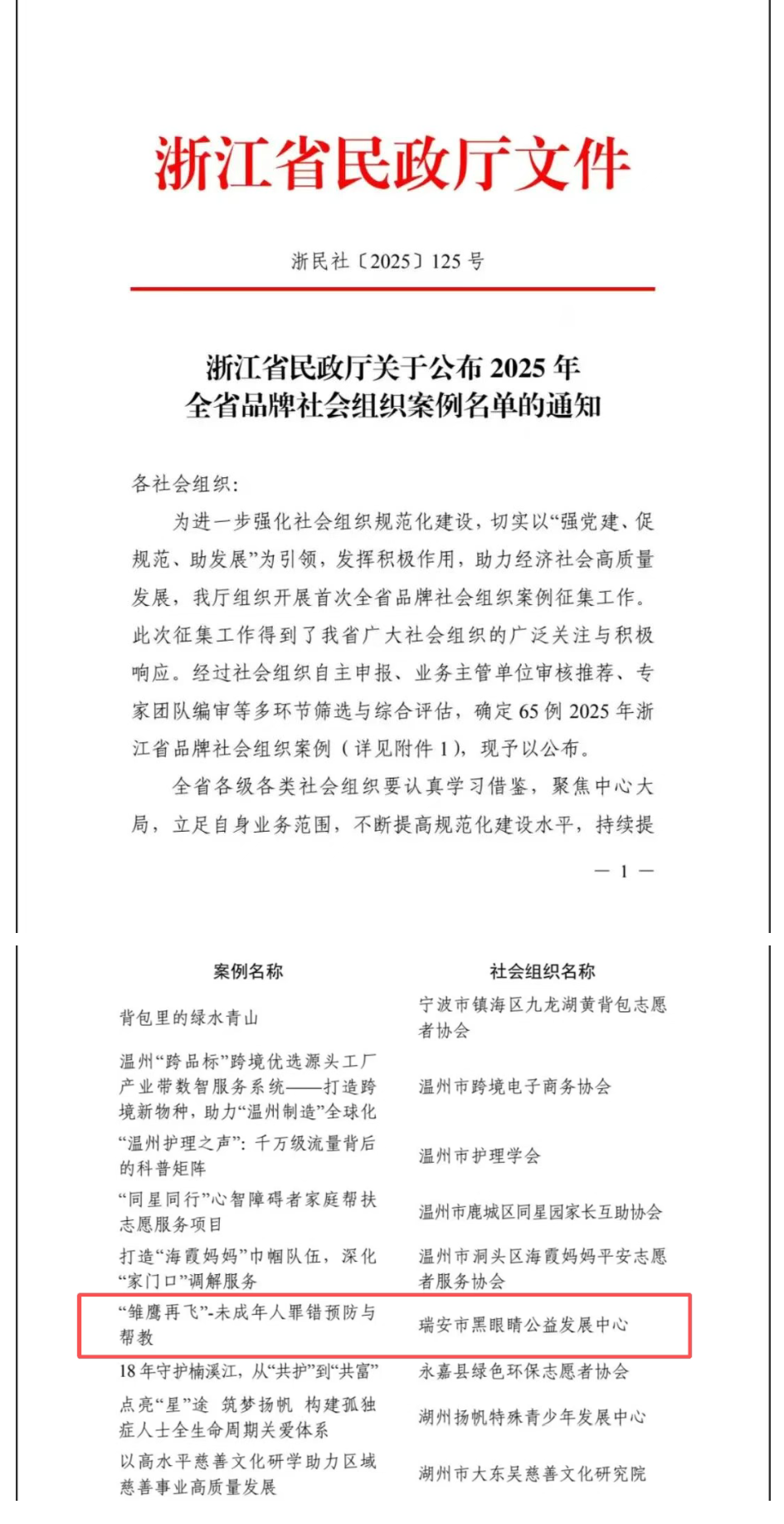 近日,浙江省民政厅公布2025年全省品牌社会组织案例名单,瑞安市黑眼睛公益发展中心打造的《“雏鹰再飞”—未成年人罪错预防与帮教》案例榜上有名,成为我市唯一入选获评的组织。