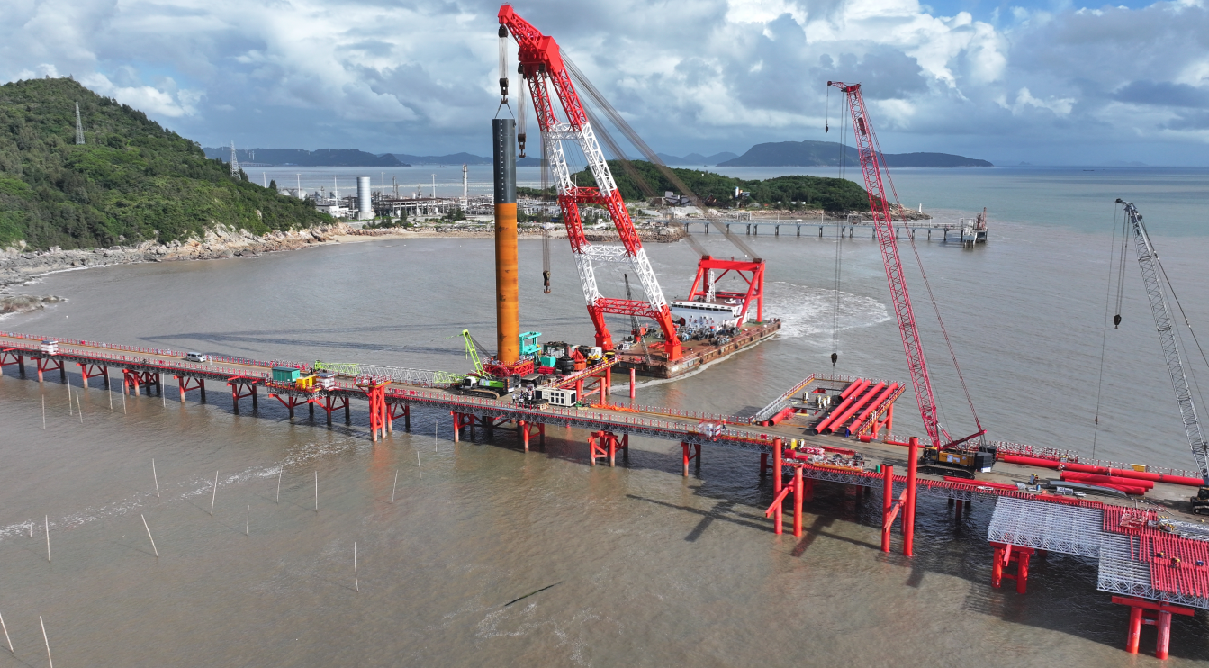 据介绍,洞头支线第TJ03标段内的4.69公里温州湾跨海特大桥路段,需在34个月工期内完成23.8万立方米混凝土浇筑、3.06万吨钢筋加工及2300余片节段梁架设。“首桩浇筑比计划提前,这得益于前期主栈桥施工的高效推进。”技术员陈炳木说,通过优化栈桥钢管桩定位,建设者们将单个钻孔平台搭设时间从15天压缩至10天。截至目前,主栈桥搭设已逾700米,同步搭设了3个钻孔平台和1个堆料平台,为后续桩基施工提供了关键作业面。