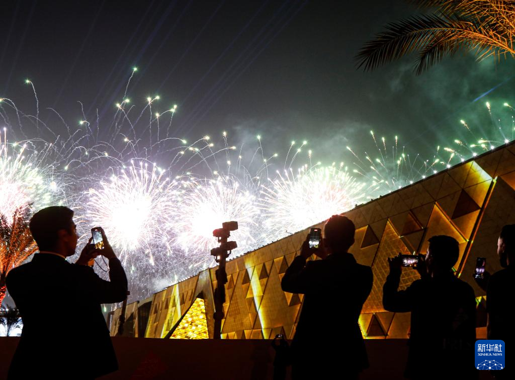 这是11月1日在埃及吉萨拍摄的开馆仪式上的无人机表演和灯光秀。