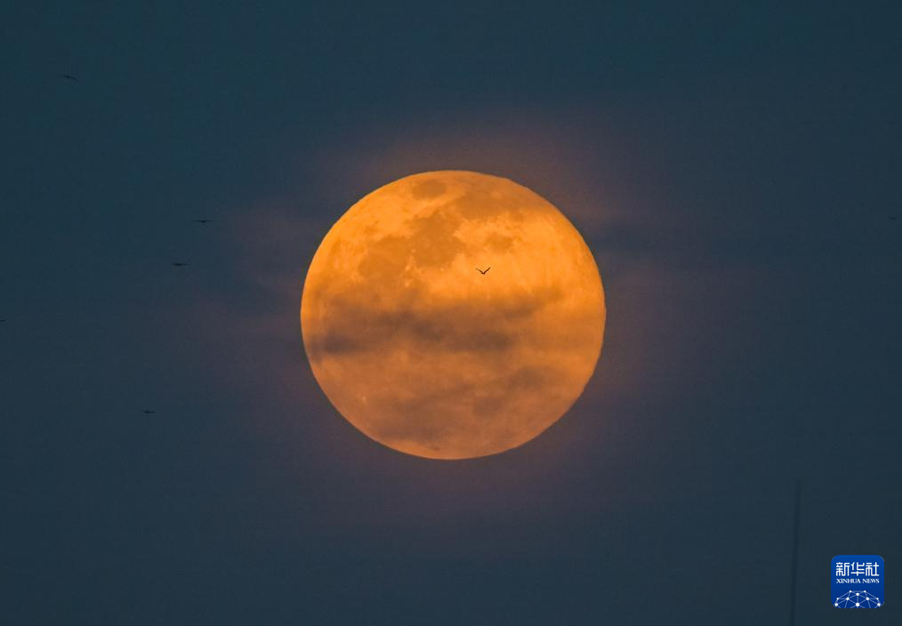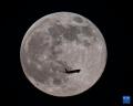 这是11月5日在科威特首都科威特城拍摄的“超级月亮”和一架飞机。当日,“超级月亮”现身天宇。
