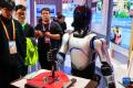 11月5日,在第八届进博会国家展中国馆,一名伊朗参展商和机器人握手。