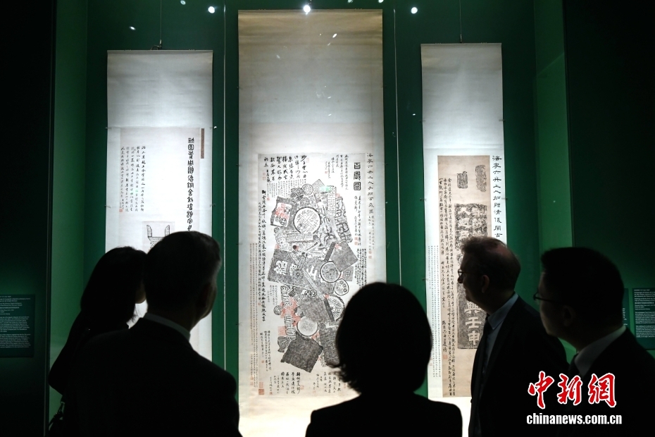 当地时间11月6日,“中国,往日痕迹:文物的发现与艺术的复兴”展览在巴黎赛努奇亚洲艺术博物馆亮相。图为嘉宾在欣赏清代金石学家六舟的作品《百岁图》。
