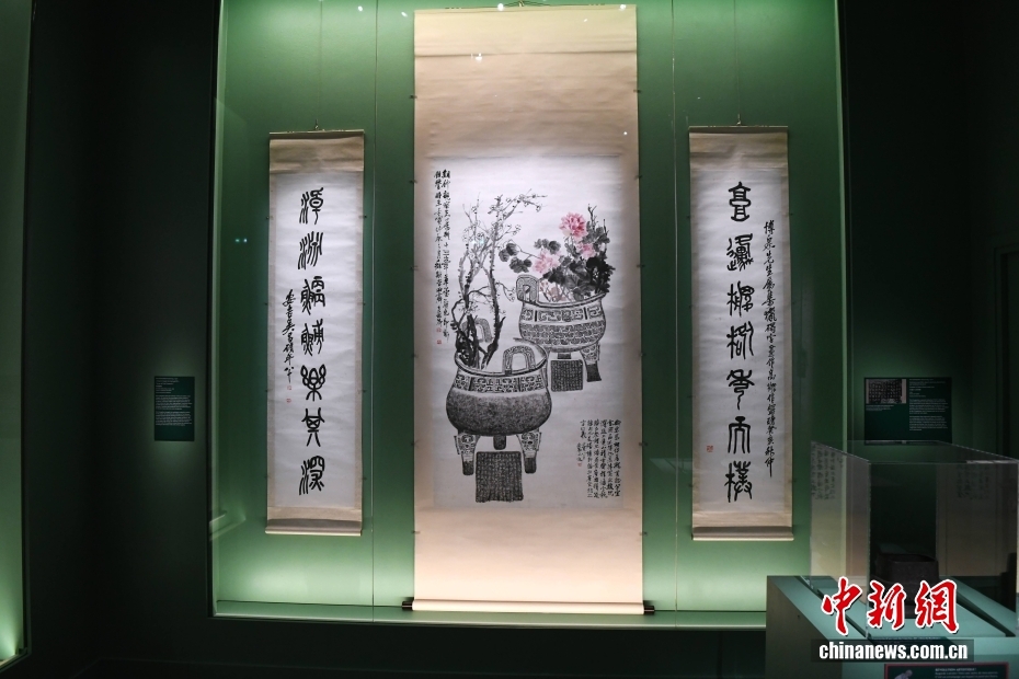 当地时间11月6日,“中国,往日痕迹:文物的发现与艺术的复兴”展览在巴黎赛努奇亚洲艺术博物馆亮相。图为著名书画家吴昌硕创作的表现青铜鼎意象的作品。