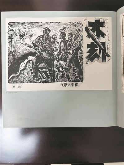 陈丹青打开了《浙南游击根据地四画家·陈沙兵》,翻至抗战篇章《曾经岁月》,其开篇之作就是《保卫大浙江》。这个创作于1940年的木刻版画纸张已经泛黄,画中军人、农民、工人等,手持步枪、菜刀、铁镐、木棍守卫浙江大地,细腻的刀工勾勒出军民的坚毅神态,遒劲的线条赋予画面强烈的动感,令观者仿佛亲临那个战火纷飞的年代,感受到他们呐喊的神情、决不后退的姿态和中华民族不屈的铮铮铁骨。
