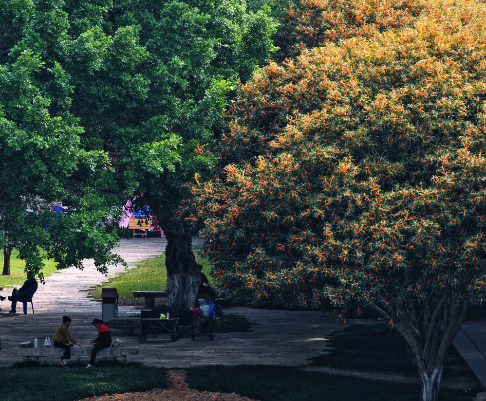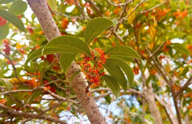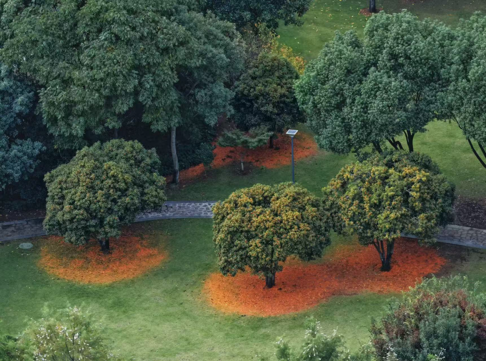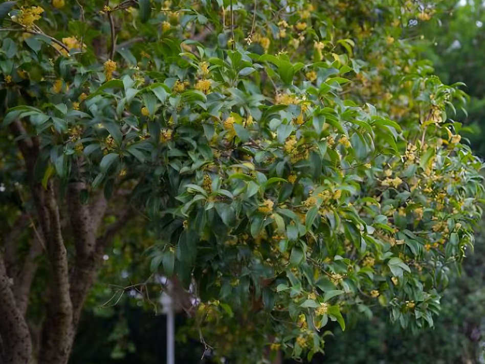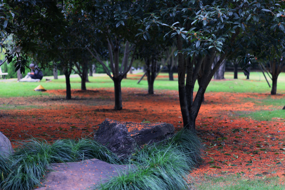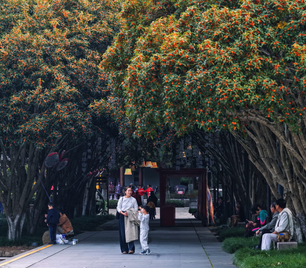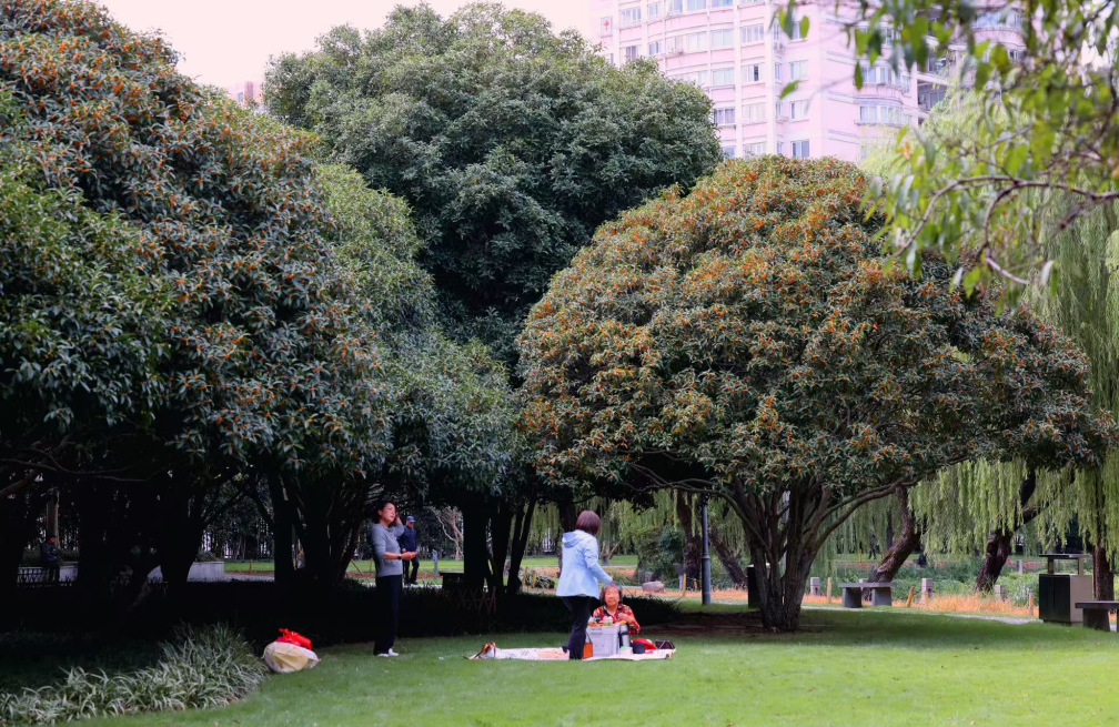 桂树错落分布于步道两侧,市民或驻足细嗅,或铺开野餐垫享受秋光,孩童追逐着飘落的花瓣,笑声与花香交织。