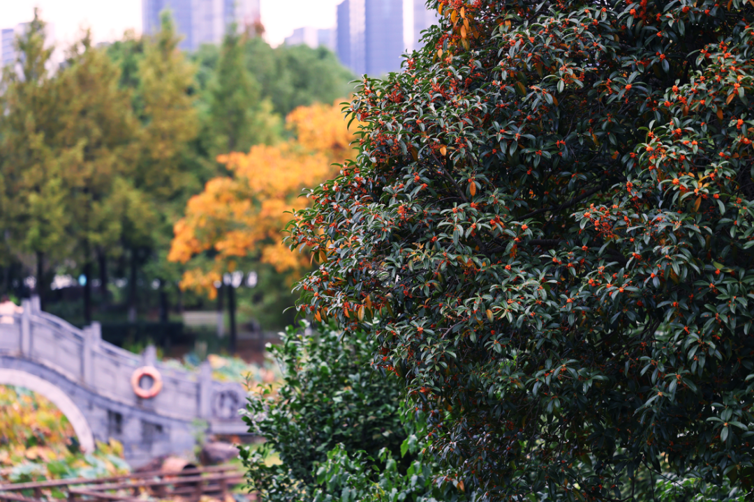 作为市区公园桂花数量最多(1500余株)、品种最全(丹桂、金桂、银桂、四季桂等)的观赏地,这里堪称桂花“嗅觉盛宴”。行至此处,各色桂花形成的“香阵”扑面而来,所谓“桂子月中落,天香云外飘”,在此得以切身感受。