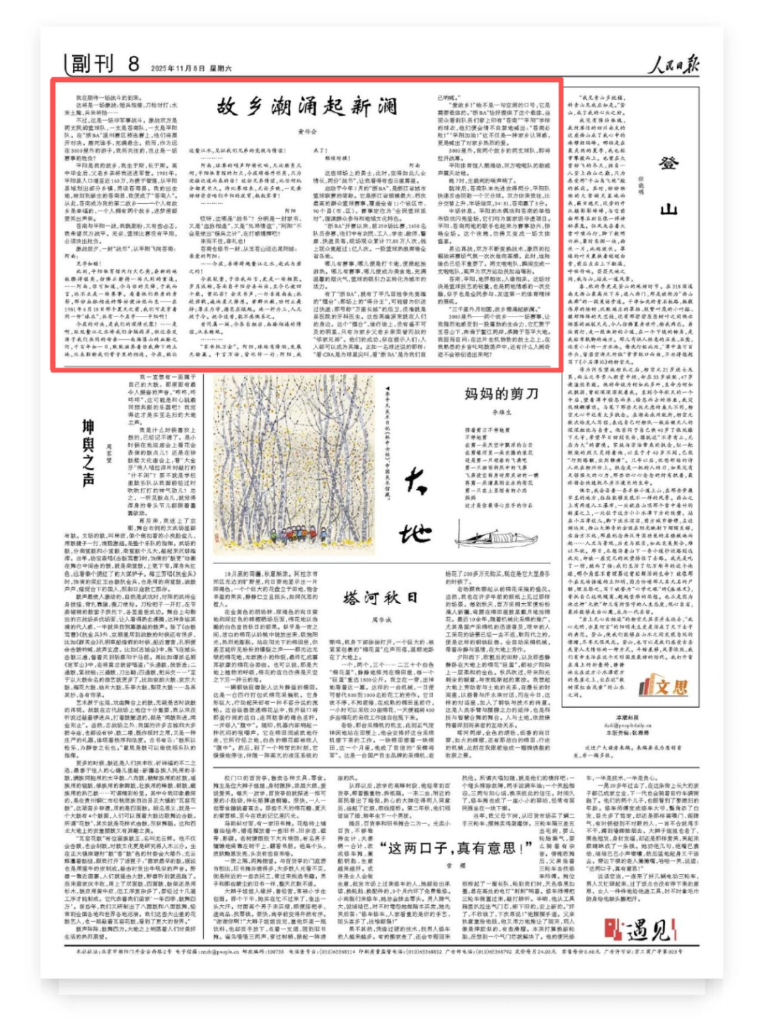2025年11月8日,《人民日报》大地副刊刊发苍南籍作家黄传会散文《故乡潮涌起新澜》。