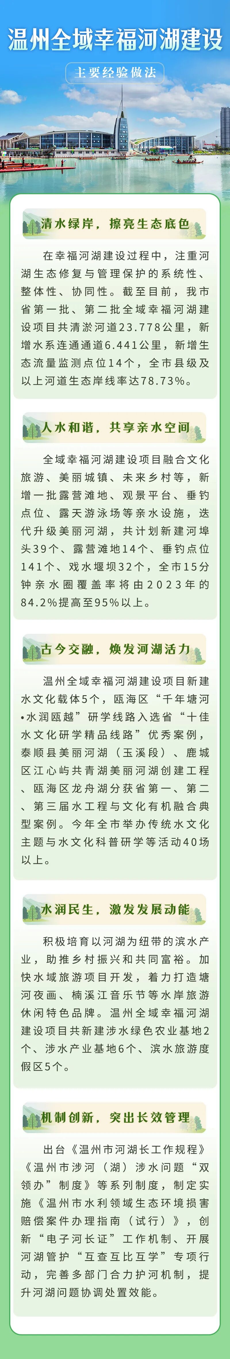 2023年以来,温州新增水上碧道431公里、滨水户外运动场所22个、城乡亲水节点216个、高品质水美乡村133个、高品质共富亲水IP103个。平阳县鳌江成功入选国家水利风景区,鹿城区汇昌河获评省“最美家乡河”,温瑞塘河、瑞平塘河、戍浦江、永强塘河、飞云湖、仕阳溪等6条河湖入选省“幸福母亲河”优秀案例。10个县(市、区)分三批次入选省全域幸福河湖建设项目(全省共44个),入选数量居全省首位。