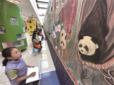 在长达172米的恢弘画卷前,阿坝州文化馆负责人为小记者娓娓道来。这是这幅国宝级巨作首次走出四川,与温州市民见面。这幅被誉为“行走的非遗百科全书”的唐卡长卷,以600余只憨态可掬的大熊猫为主线,细腻勾勒出阿坝州13县(市)的壮丽山河、民俗风情与生态保护成就。唐卡作为阿坝州非物质文化遗产,是传统手工艺的一大瑰宝。