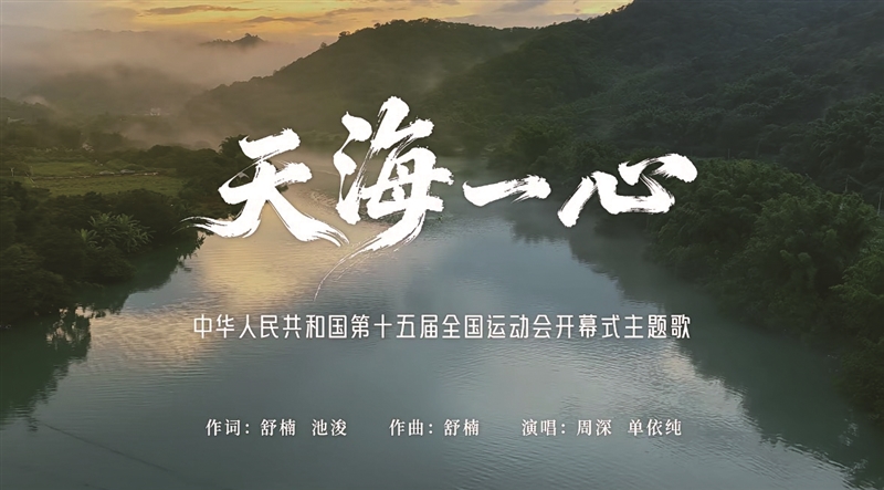 全运会主题歌《天海一心》由国家一级作曲、十五运会开幕式音乐总设计舒楠主导创作,温籍艺术家池浚参与作词,由周深和单依纯在十五运会开幕式上正式唱响。