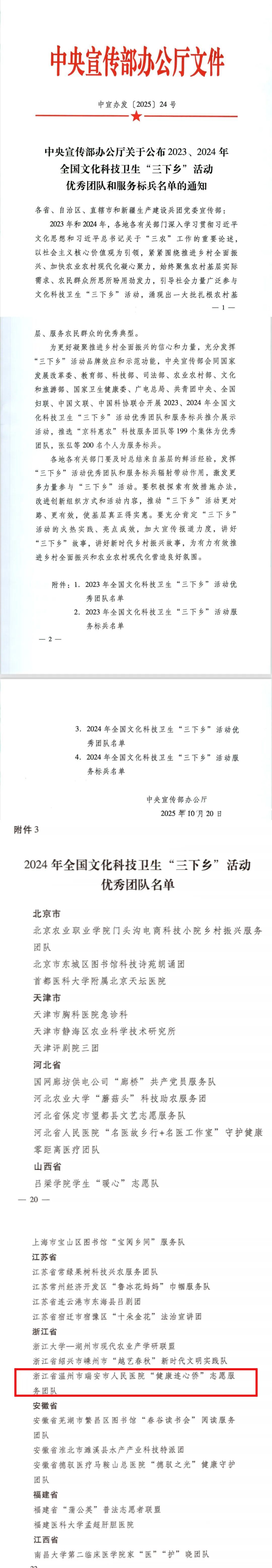 近日,中共中央宣传部办公厅公布《2023、2024年全国文化科技卫生“三下乡”活动优秀团队和服务标兵名单》,由温州市委宣传部推荐申报的瑞安市人民医院“健康连心侨”志愿服务团队荣获2024年全国文化科技卫生“三下乡”活动优秀团队。这也是温州继“超女来了”志愿服务团队、“银发守望”服务团队获“三下乡”优秀团队之后,第3次斩获这项国家级荣誉。