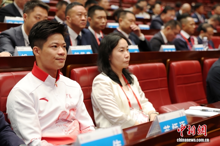 11月10日,全国群众体育先进单位先进个人、全国体育系统先进集体先进个人表彰大会在广州召开。图为武大靖(右)等运动员参会。