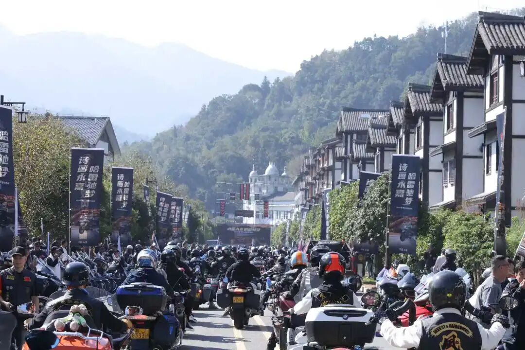 开幕仪式后,这里还上演了一场历时一小时的山水巡游活动,数百辆重型机车排成整齐方阵,从四季云岚度假酒店启程,途经温常线与仙清南路十字路口后折返,骑士们在蜿蜒道路上风驰电掣,感受沿途由青山、绿水、田园、古村串联而成的流动画卷。本次活动还吸引了来自台湾的机车爱好者们前来体验参与。