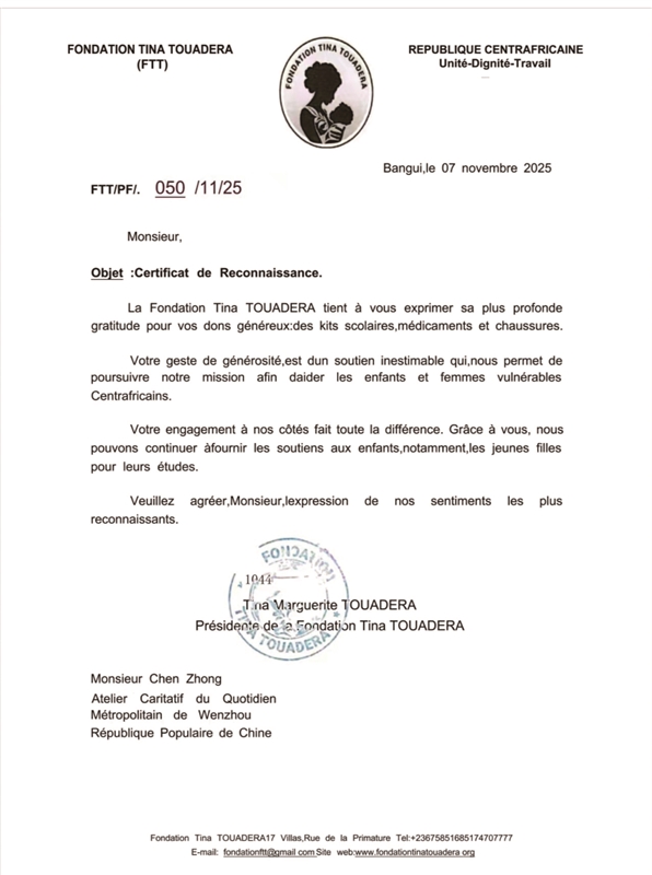 温州网讯 近日,中非共和国总统夫人蒂娜·图瓦德拉向温州都市报陈忠慈善工作室、瓯海区慈善总会、瓯海区人民教育基金会、温州曙光中西医创面修复医院院长陈善亮、温州市慈善总会秘书长李武、温州医科大学附属第一医院医务部主任暨玲等发来感谢信,感谢以上单位和个人慷慨捐赠了100多万元文具、鞋子、药品等爱心物资,帮助了中非共和国的弱势儿童和妇女。