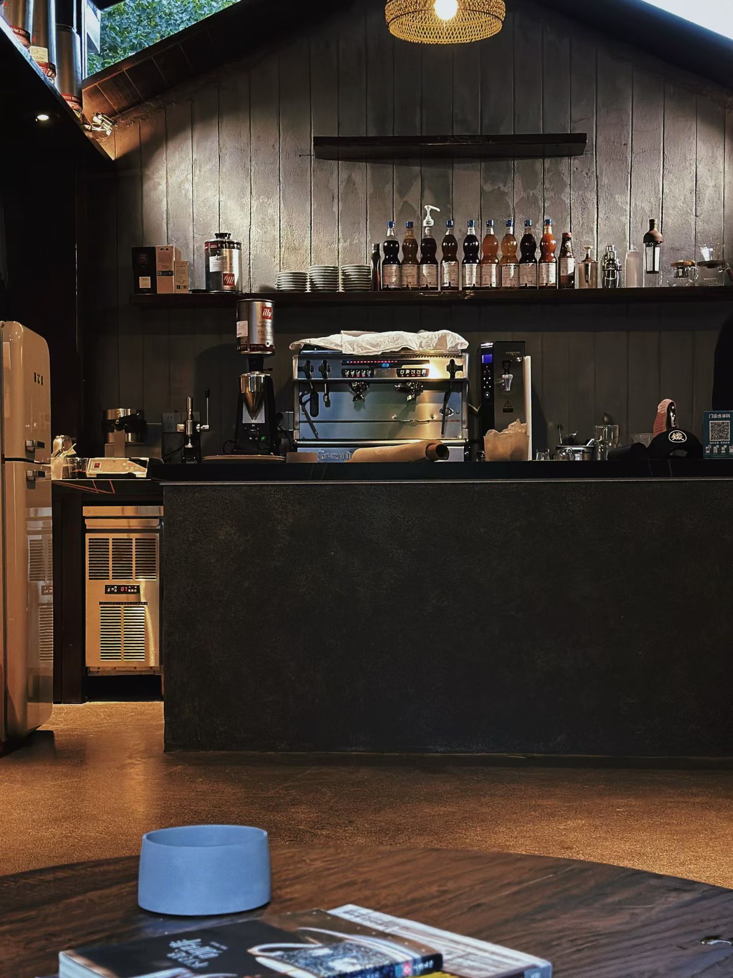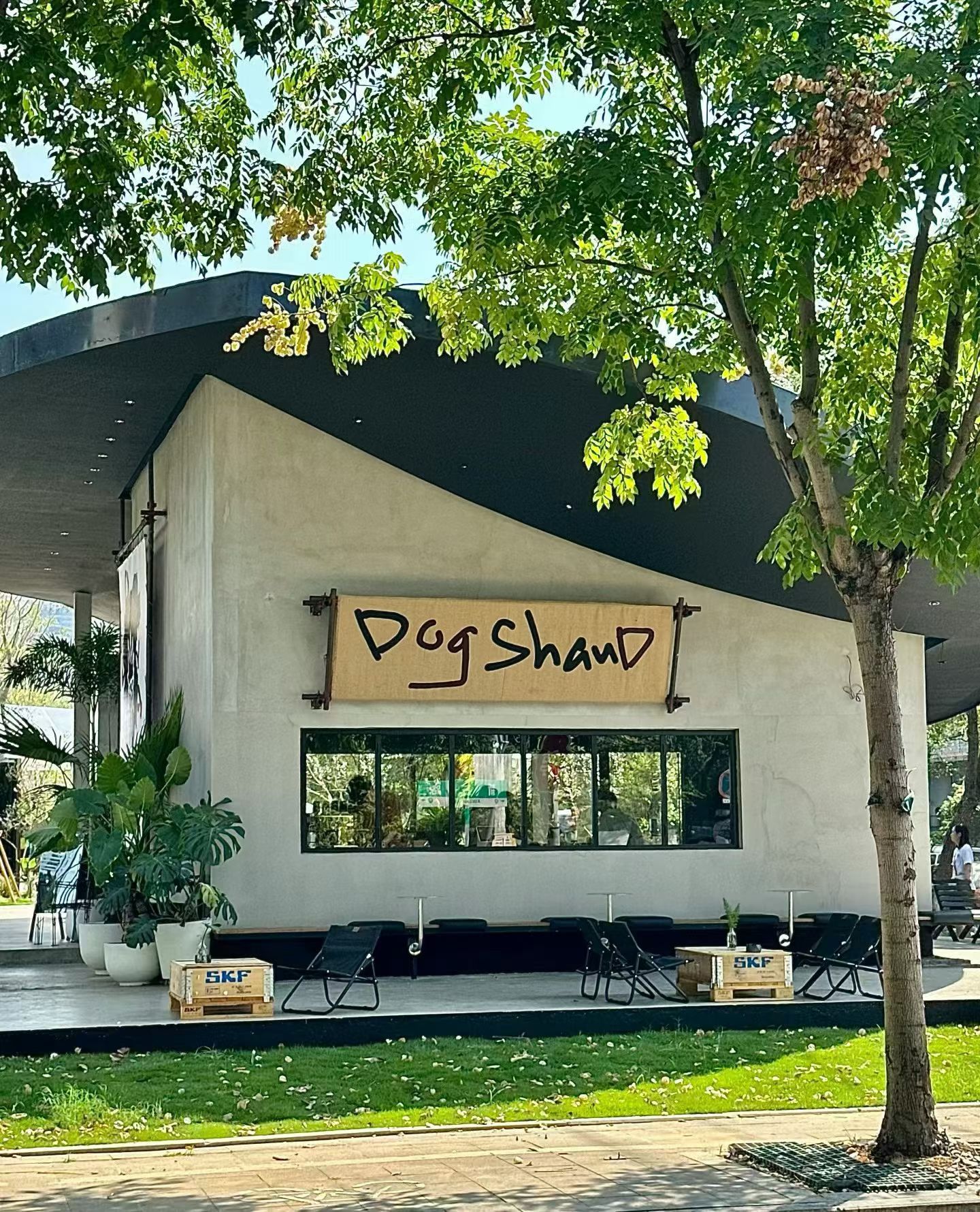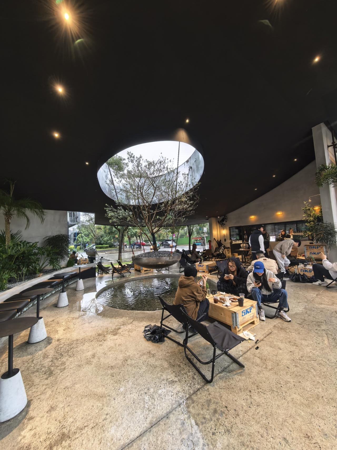 这家位于工业园区的咖啡馆,装修设计上也颇具工业风格,复古白墙搭配黑色斜顶,户外折叠椅加上木质小桌,镂空的穹顶,一棵橄榄树悬于水池之上,随手一拍都是光影大片。