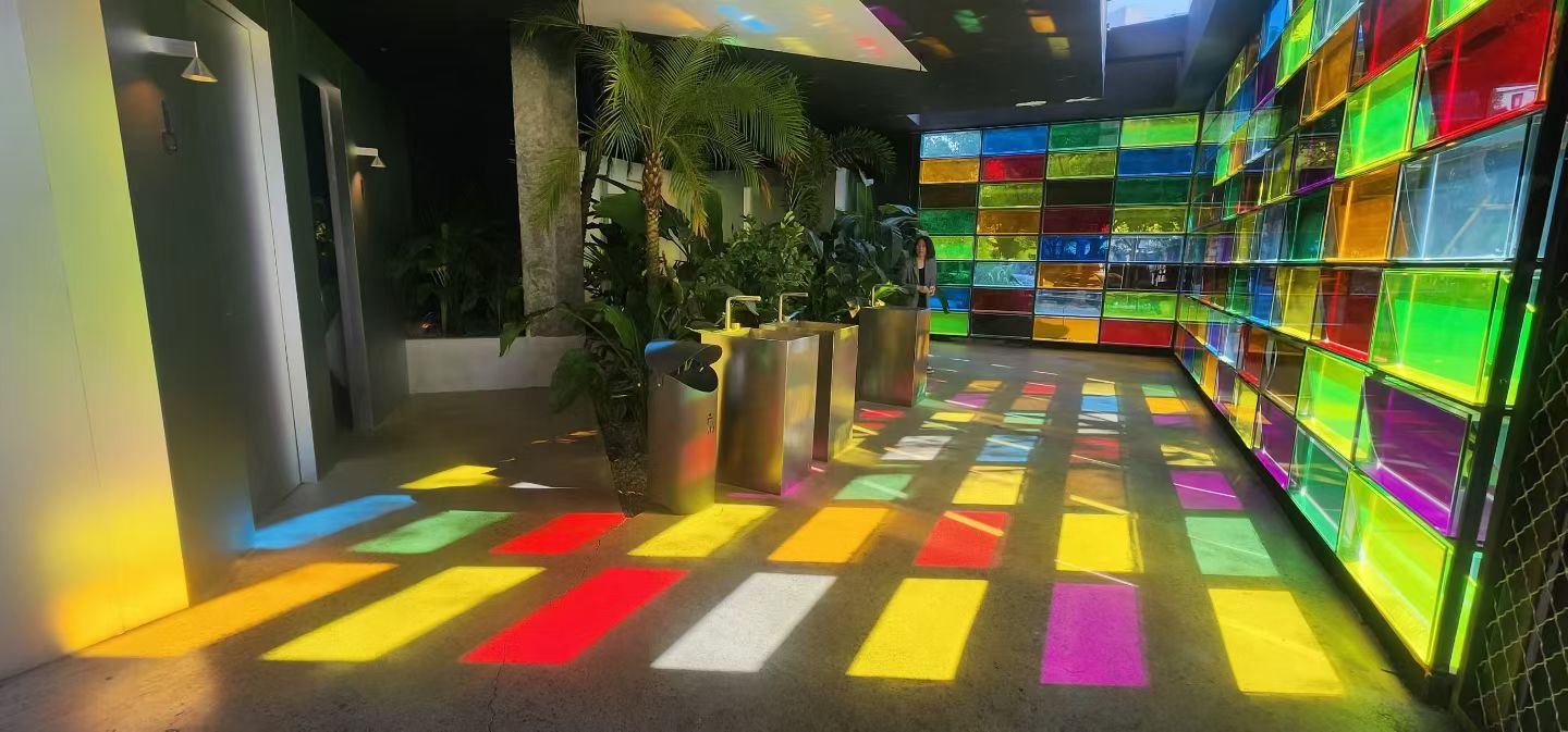 与写字楼或商铺中的网红咖啡馆不同,大狗闪电咖啡馆像褪去了洋气外衣一样,拆掉了围墙,和周边餐饮、雕塑、复古艺术馆、明星海报、运动场馆等多业态连点成片,便形成了更具艺术性与开放型的社区氛围。不少市民喝完咖啡,去巨型海报、雕塑旁打卡。不远处,还有被赞“温州最美厕所”的“彩色卫生间”,两排彩色亚克力板替代传统墙面营造出色彩斑斓的独立空间,当阳光透过彩色墙面,在地上投射出流动的彩虹光影,吸引了众多游客慕名前来打卡。