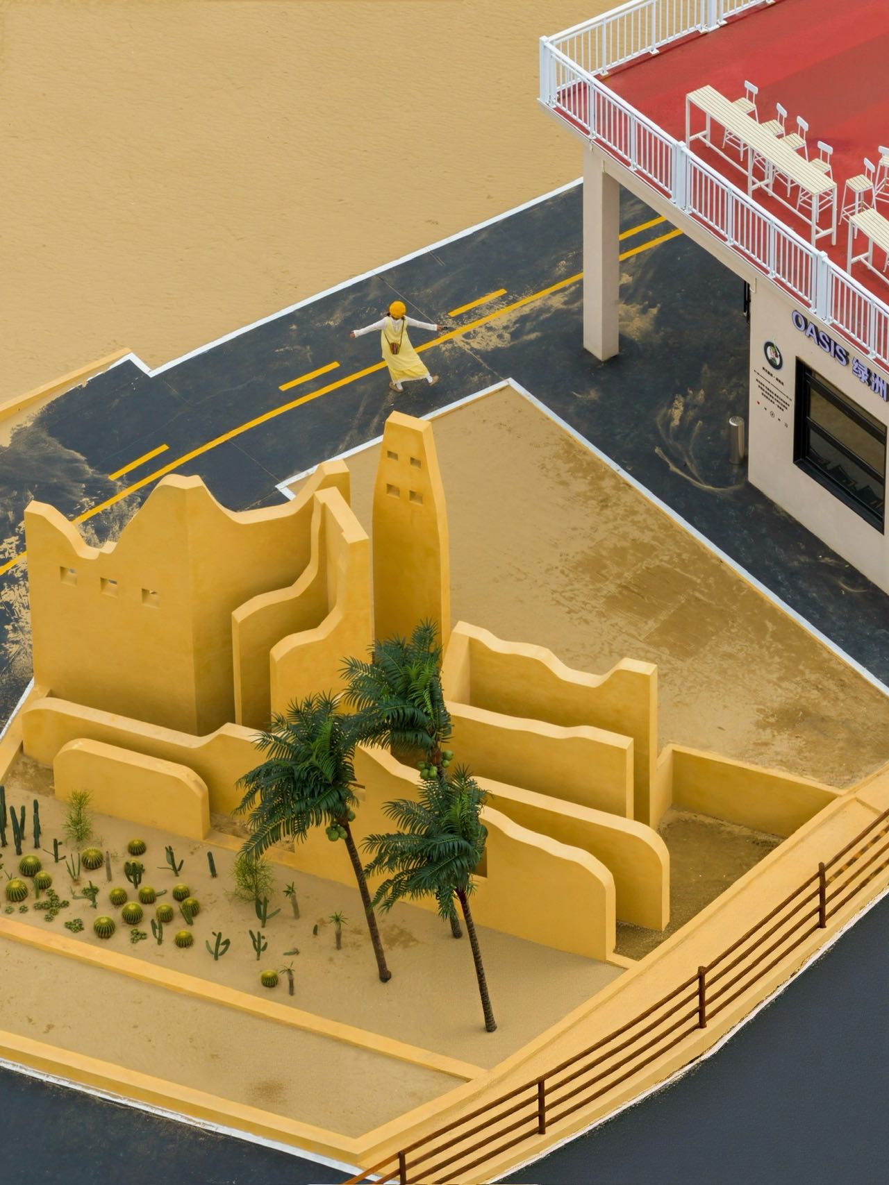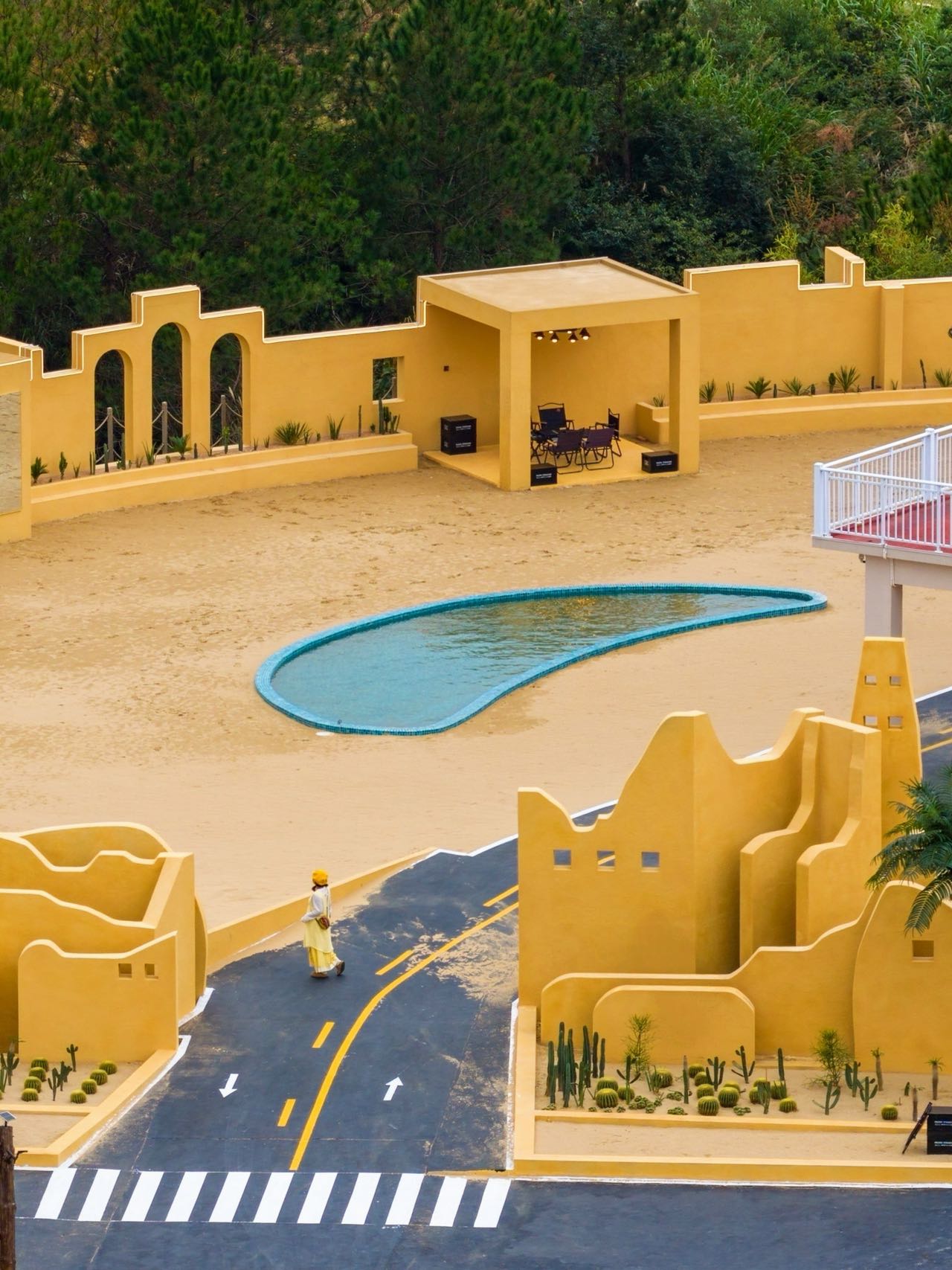 今年,位于营地入口处的绿洲咖啡馆进行了全面改造提升,别具一格的沙丘造景、黄棕色沙粒铺满地面、仙人掌错落有致,还有一湾湛蓝的“月牙泉”、专为孩子们设计的戏沙池,枯树秋千、铁质躺椅点缀其间……每个角落都像精心布置的电影片场,成为了网红达人、市民游客的热门打卡点。