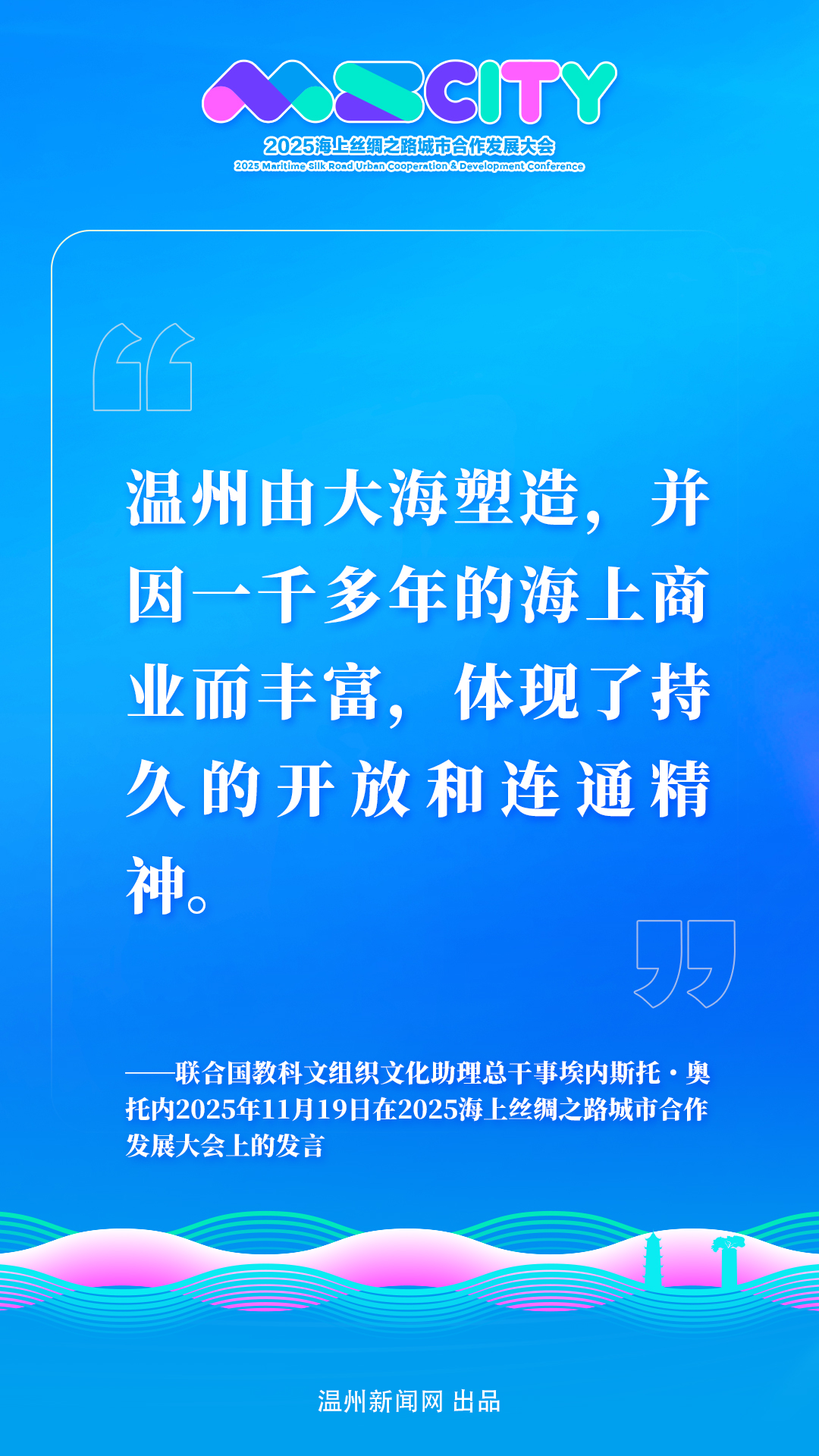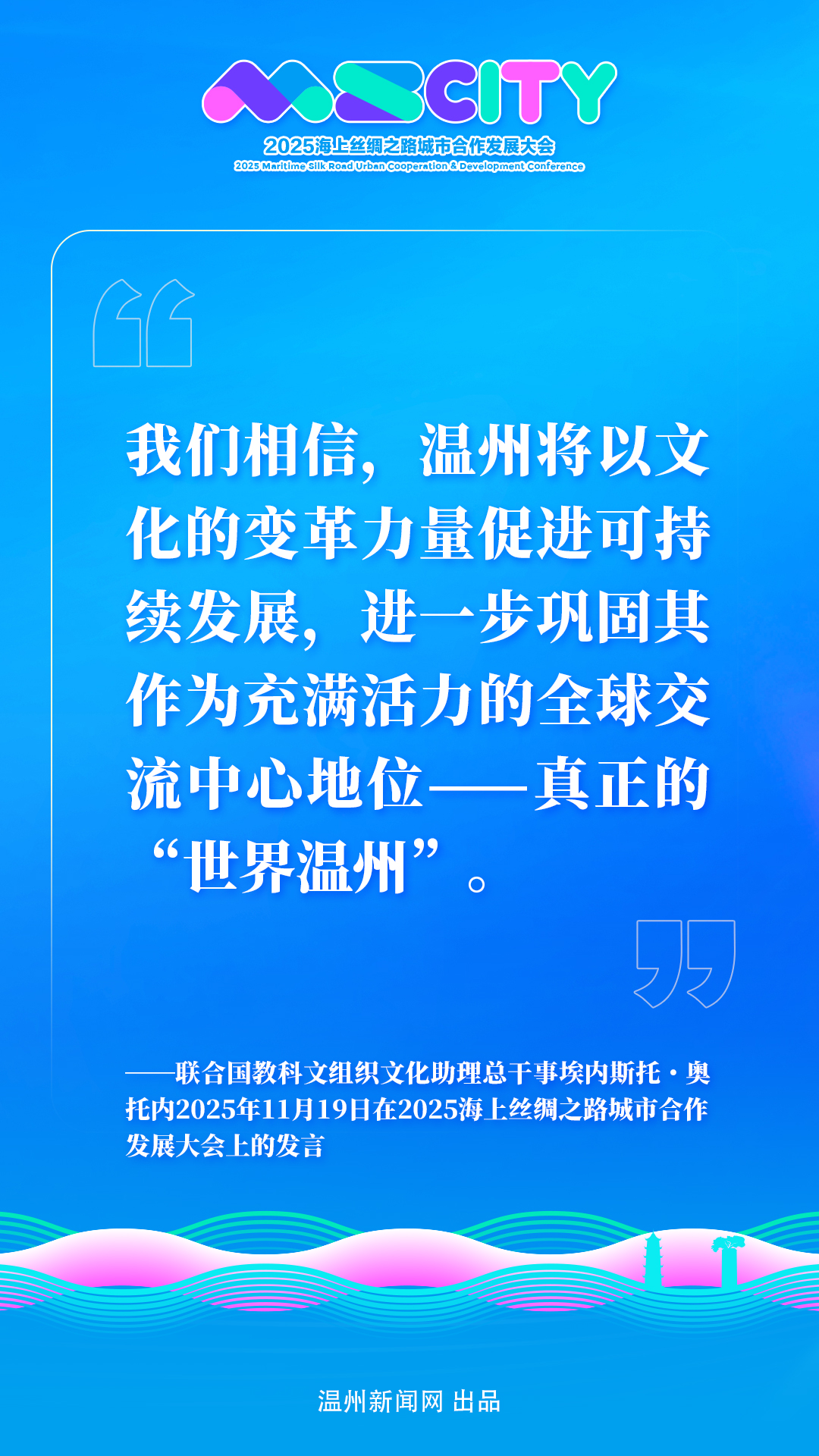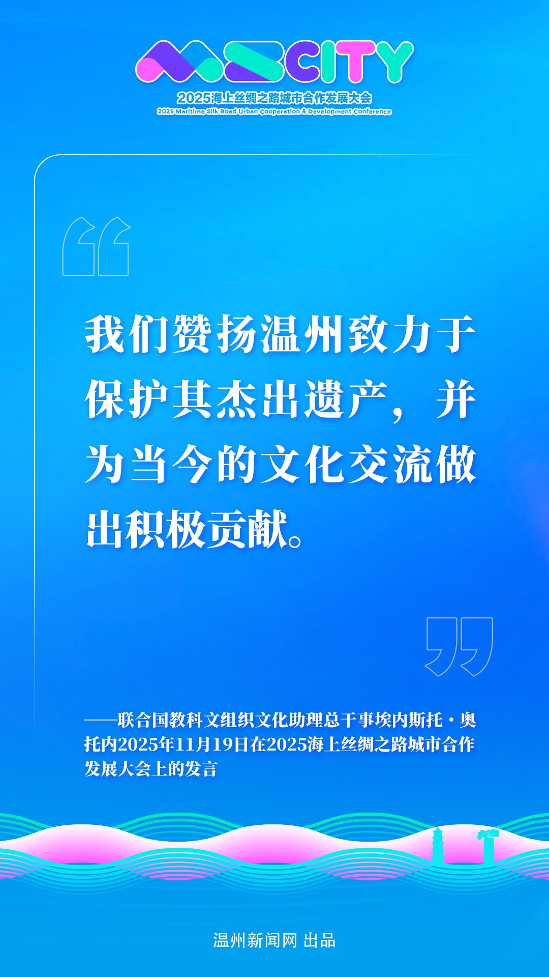 温州网讯(记者 温婉)2025年11月19日下午,在中国温州召开的2025海上丝绸之路城市合作发展大会暨国际旅行商大会主大会上,联合国教科文组织文化助理总干事埃内斯托·奥托内发表视频致辞,向温州表示热烈的祝贺。