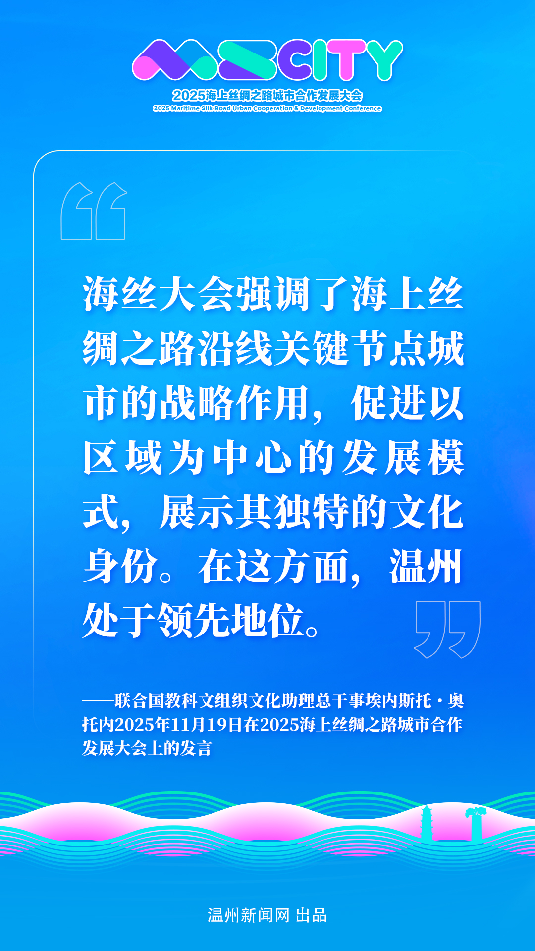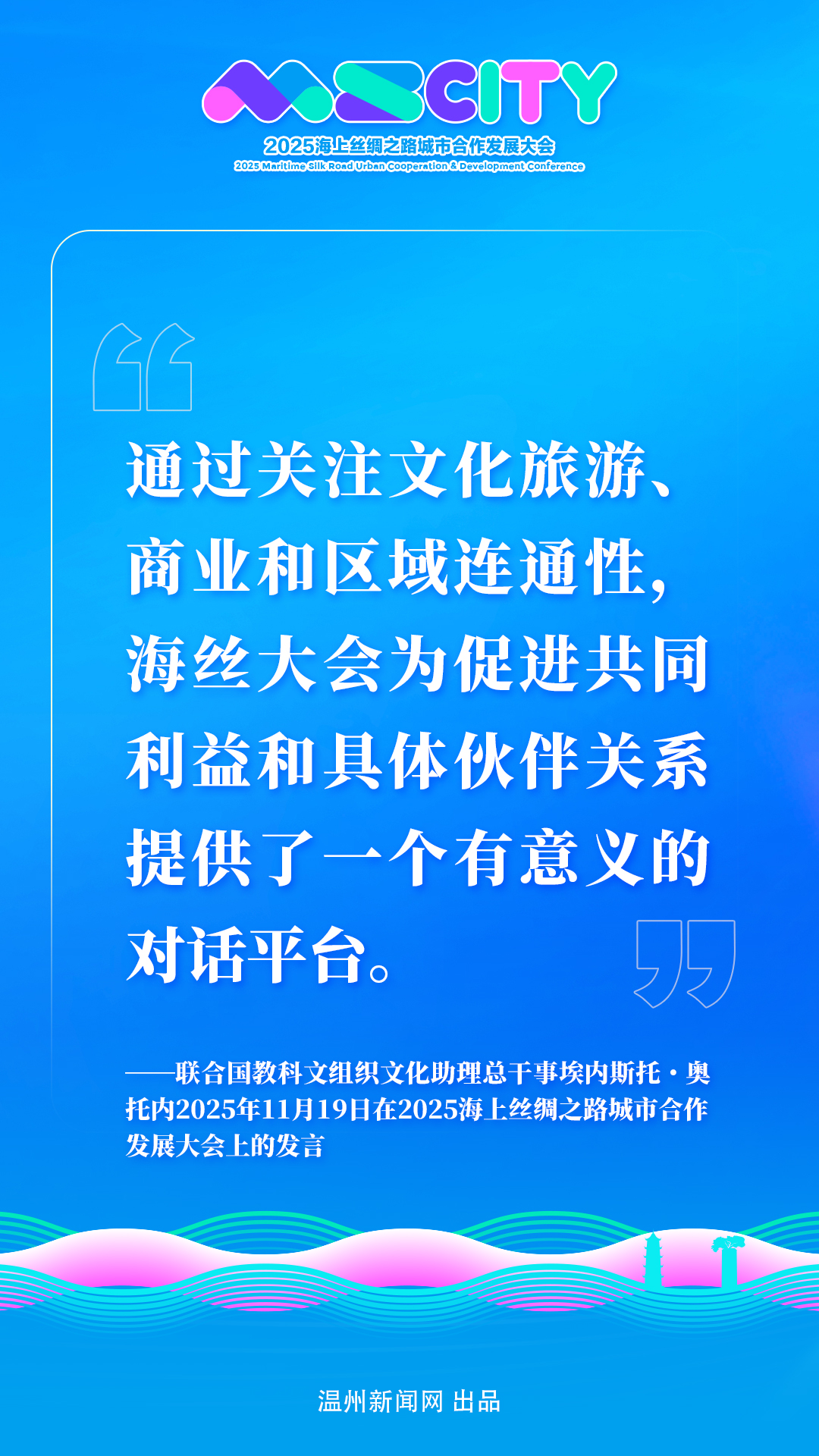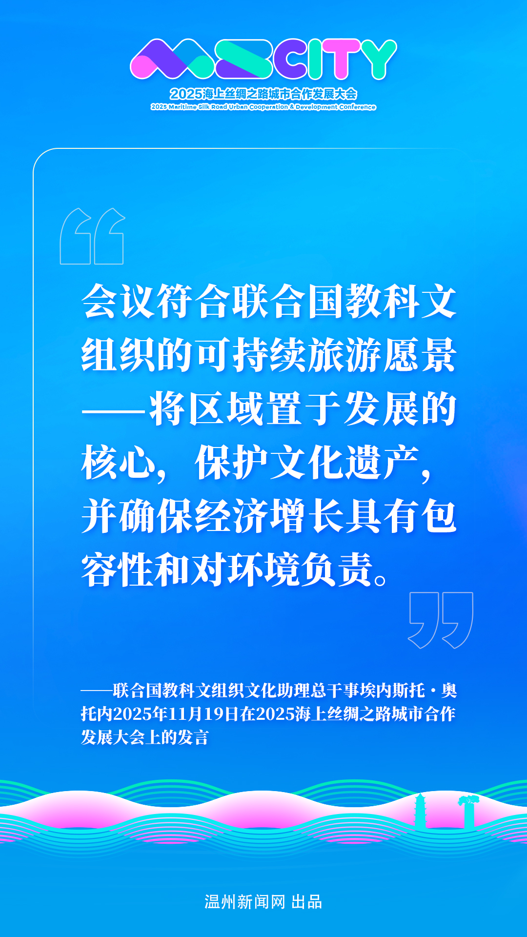 温州网讯(记者 温婉)2025年11月19日下午,在中国温州召开的2025海上丝绸之路城市合作发展大会暨国际旅行商大会主大会上,联合国教科文组织文化助理总干事埃内斯托·奥托内发表视频致辞,向温州表示热烈的祝贺。