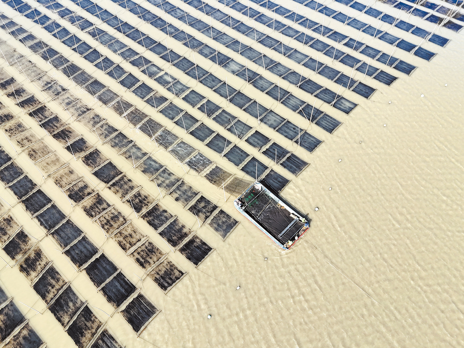 连日来,在乐清湾大门大桥两侧浅海海域,养殖户趁着晴好天气,在紫菜养殖网格内采收头茬紫菜,养殖船来回穿梭采收、装船、转运,“海上菜园”一片繁忙景象。据悉,紫菜是多茬生长,每隔10余天可割一茬,第一茬叫作“头水”紫菜。“头水”紫菜产量虽低,但口感好、营养价值高,是市场上的抢手货。蔡宽元 摄