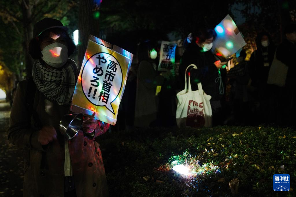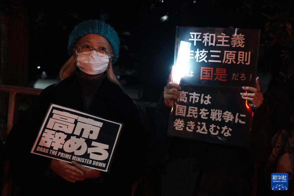 11月21日,在日本东京的首相官邸外,民众参加抗议活动。数百名日本民众21日晚在位于东京的首相官邸前举行集会,抗议日本首相高市早苗近日在国会发表的涉台错误言论,要求其撤回相关表态并作出解释和道歉。新华社记者 贾浩成 摄