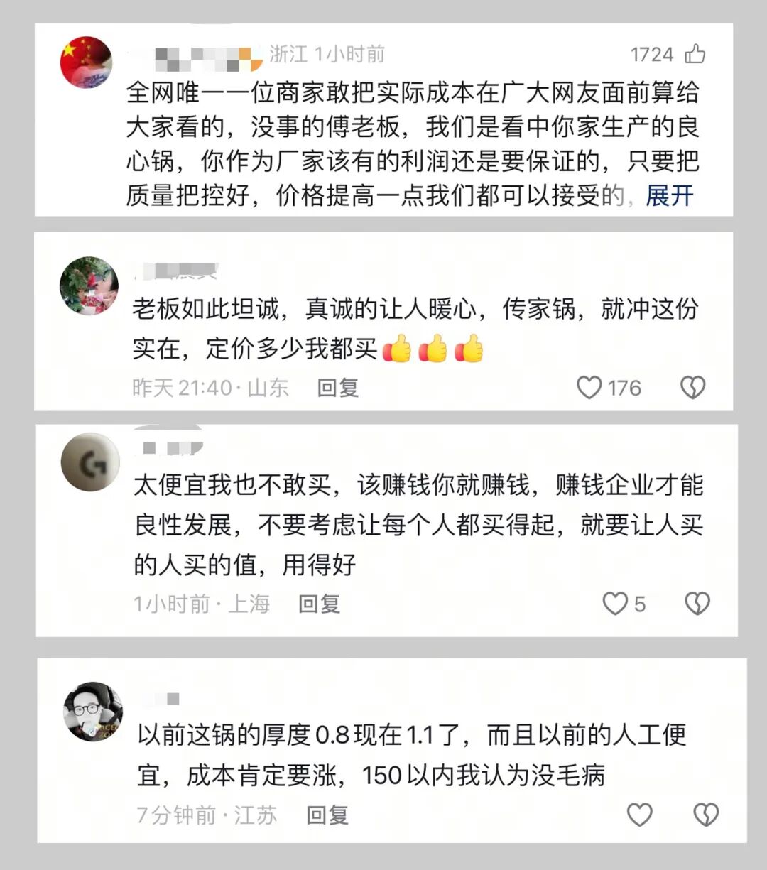 老板“摊开成本”卖锅,消费者“明明白白”下单。傅克萍“公开成本”的举动,收获了云股东们的“花式护航”。