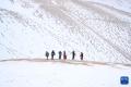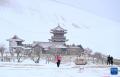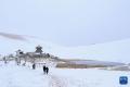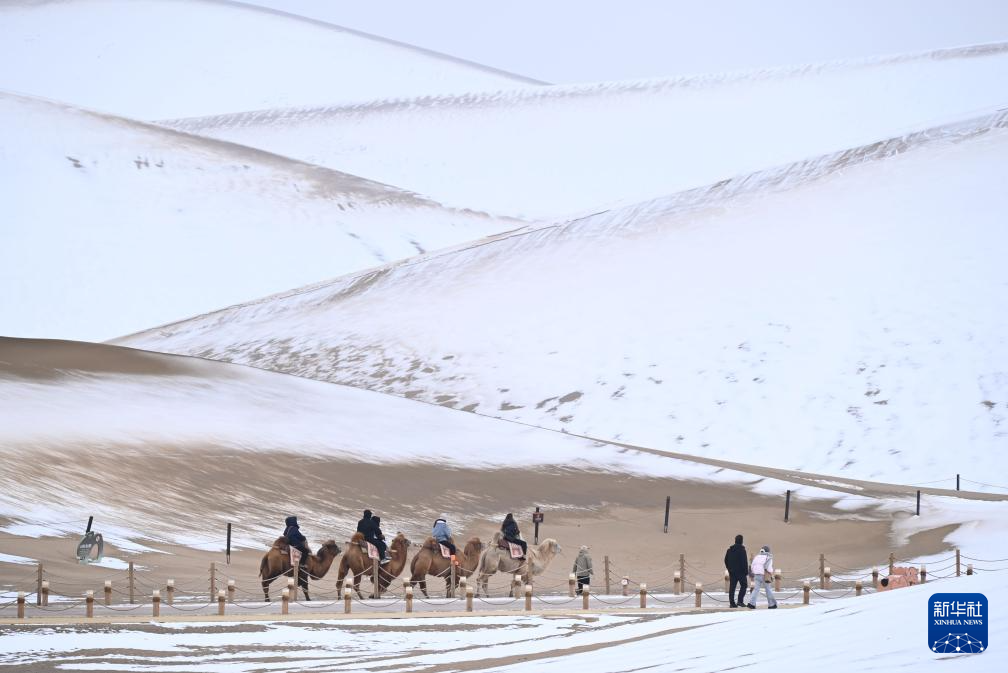11月23日,游客在甘肃省敦煌市鸣沙山月牙泉景区游览。11月23日,受冷空气影响,甘肃省敦煌市迎来降雪,当地著名景点鸣沙山月牙泉银装素裹,美不胜收。新华社发(张晓亮摄)