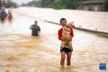 11月25日,在泰国宋卡府合艾市郊,一名男子携宠物狗涉水前行。