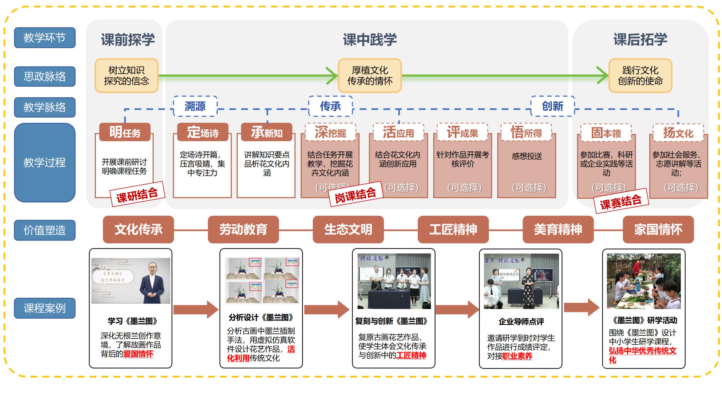 王伟深耕花文化教学十余年,始终坚信“每一朵花都是思政教育的活教材”。在《墨兰图》花艺研学课程中,他没有停留在插花技巧的传授,而是带领学生追溯画作背后的历史脉络和民族气节。学生们通过虚拟仿真软件预演构图,再用真实花枝复刻古画,在调整枝叶角度、搭配花材色彩的过程中,不仅掌握了东方插花的“留白之道”,更体会到“兰为王者香”的精神内核。有学生在研学报告中写道:“原来插花不止是审美,更是与先贤对话、传承文化的方式,这让我们对‘家国情怀’有了更鲜活的理解。”