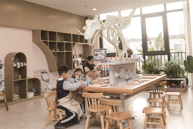 据介绍,桂华园区打造了“暖、矮、趣”为核心的成长环境,“生活感官家”回应式照护体系中,将婴幼儿的一日生活转化为教育契机,使饮食、如厕、睡眠等环节成为培养习惯与认知发展的生动课堂。在江亦舒看来,真正形成桂华园区照护特色的是医育结合。桂华园区是由瓯海区卫健局与瓯海区教育局联合打造的浙江省首家公办托育园,近日被列入全国第二批医育结合托育实践项目优秀单位。