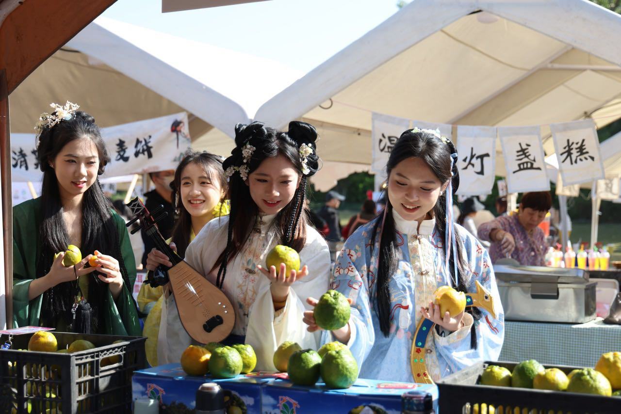 现场,古风汉服巡游队伍穿梭其间,成为一道流动的风景线,身着传统服饰的游客可免费乘坐观光车,打卡花韵手划船,尽享湿地美景。“集吉打卡”区的乡音传吉、暗香寻吉等互动游戏前围满了参与的亲子家庭,完成游戏集齐印章即可抽取精美好礼。市集区域内,瓯绣文创、古法糖画、老姜糖等非遗摊位与水头排骨、围炉煮茶、十八家米面等特色美食摊位前人头攒动,烟火气与文化味交织。同时开启的品质“柑”货限量预售与瓯柑采摘游也吸引了不少市民咨询报名。