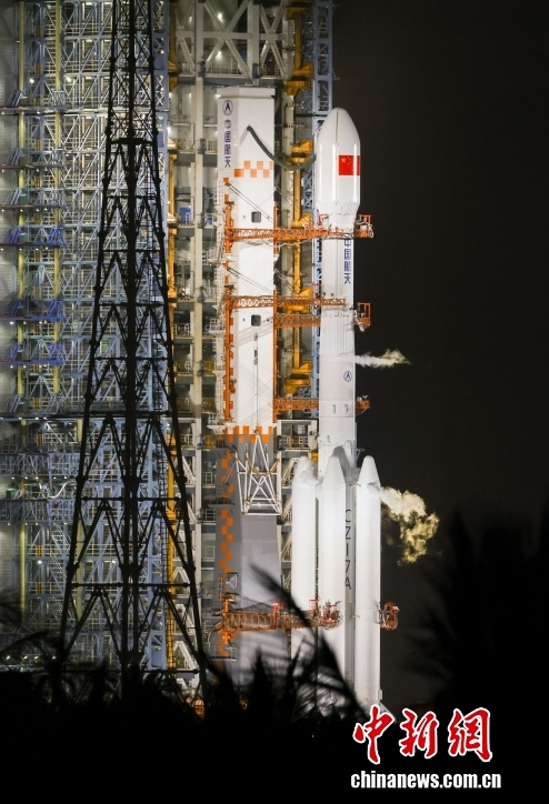 11月30日20时20分,中国在文昌航天发射场使用长征七号改运载火箭,成功将实践二十八号卫星发射升空,卫星顺利进入预定轨道,发射任务获得圆满成功。图为长征七号改运载火箭静待发射。中新社记者 骆云飞 摄
