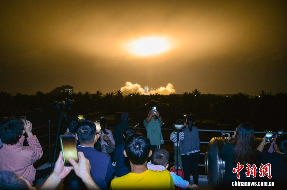 11月30日20时20分,中国在文昌航天发射场使用长征七号改运载火箭,成功将实践二十八号卫星发射升空,卫星顺利进入预定轨道,发射任务获得圆满成功。图为民众观看长征七号改运载火箭点火升空。中新社记者 骆云飞 摄