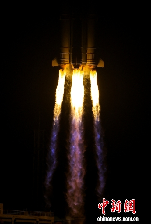 11月30日20时20分,中国在文昌航天发射场使用长征七号改运载火箭,成功将实践二十八号卫星发射升空,卫星顺利进入预定轨道,发射任务获得圆满成功。图为长征七号改运载火箭尾焰。中新社记者 骆云飞 摄