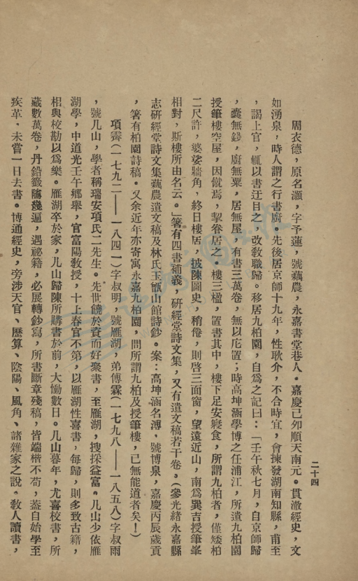 项霁,字叔明,号雁湖;其弟项傅霖,字叔雨,号几山。项霁淡泊功名,潜心古学,对项傅霖影响深远。项傅霖虽中举并曾任教谕,然而仕途不顺,每次赴试归来,必为兄长带回大量古籍。《温州藏书家考》记载,“以雁湖性喜书,每归,则多致古籍,相与校勘以为乐。雁湖卒于家,几山归陈所购书于前,大恸数日。”