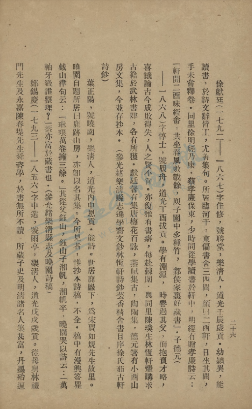 清代乐清人徐献廷所建的藏书楼“二酉轩”,藏书二万余卷,同里许乃康、蔡保东等年少时皆曾在此从学受业。《温州藏书家考》记载,“徐献廷……所居临河干,东偏书舍三四间,颜曰二酉轩,日坐其间,手未尝释卷。同里徐明经乃康,蔡孝廉保东,少时同从学读书于轩中”。