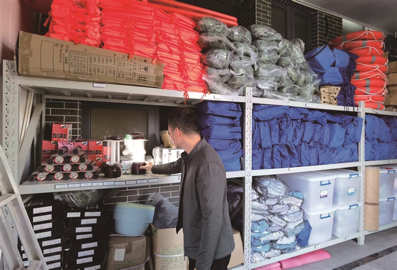 在瑞安市高楼镇龙腾村的物资仓库里,各类防汛防台物资摆放整齐