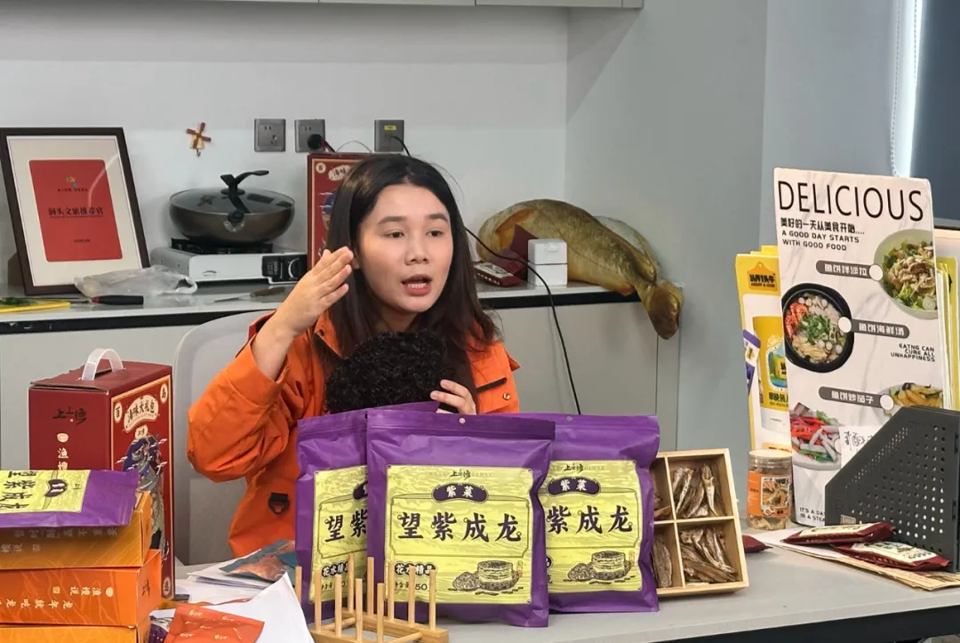 传统销售渠道稳扎稳打,电商平台则为霓屿紫菜开辟了更广阔的市场空间。在温州摸个鱼电子商务有限公司的直播间里,主播陈舒雯正拿着包装精美的“头水”紫菜,向屏幕另一端的网友细致介绍其优良品质。