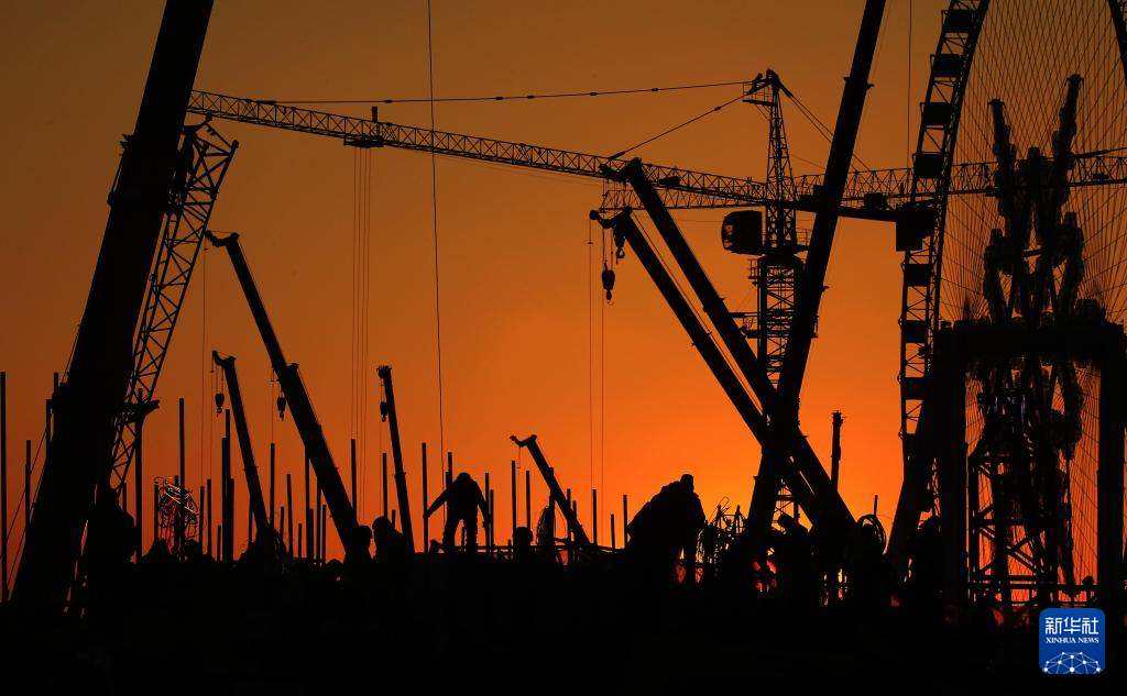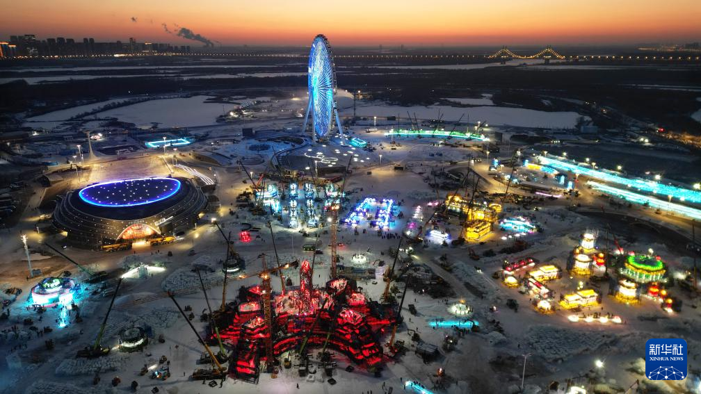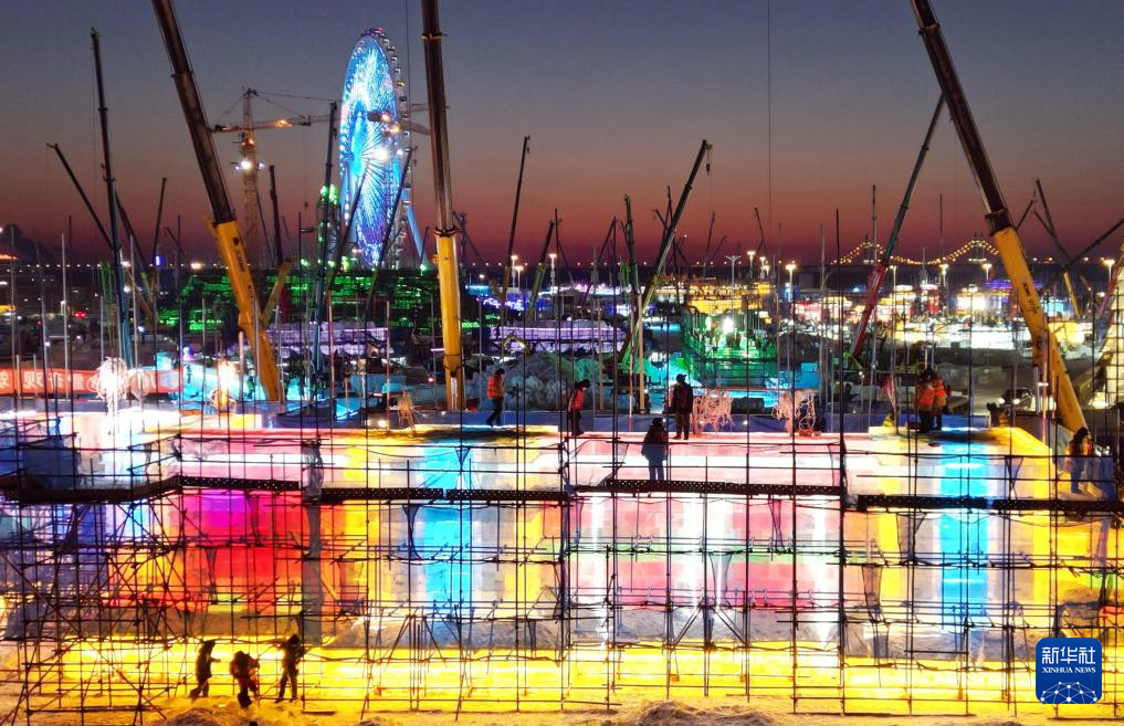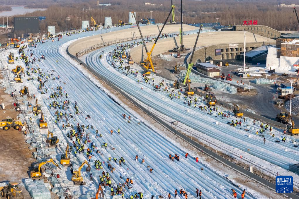 12月4日拍摄的哈尔滨冰雪大世界冰建施工现场(无人机照片)。刘洋摄