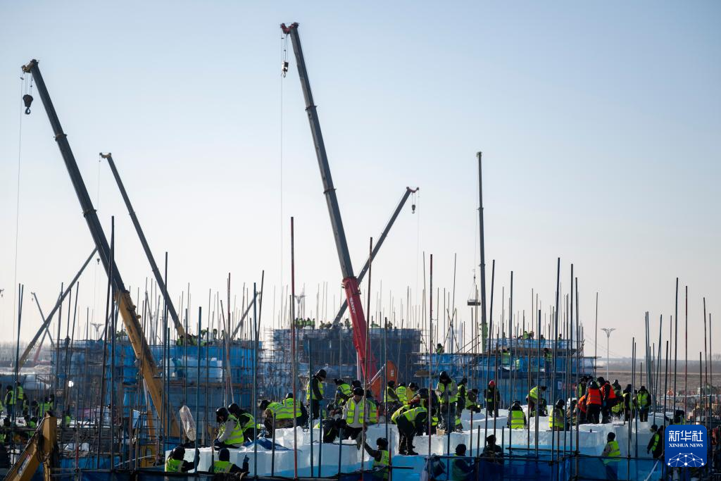 12月3日拍摄的哈尔滨冰雪大世界冰建施工现场。张树摄