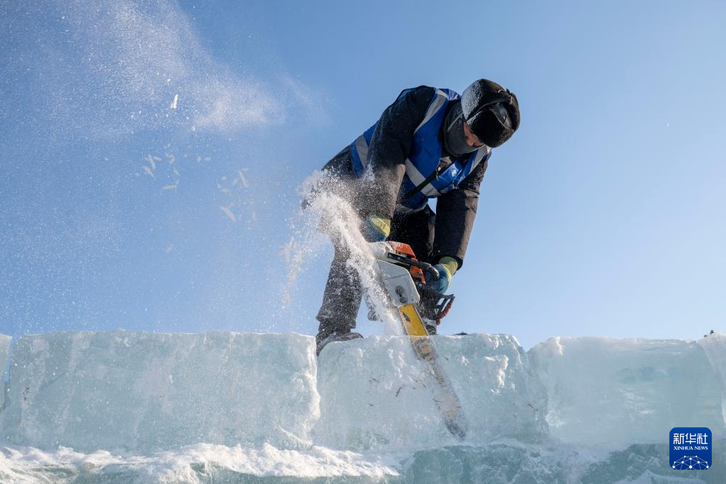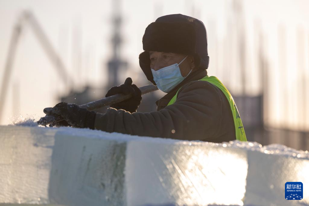 12月5日,在哈尔滨冰雪大世界施工现场,工人在进行冰建作业。记者 张涛 摄