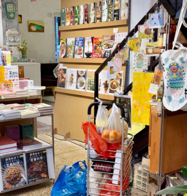 2024年7月,盘菜生书店正式对外营业,临时店开在菜场边、巷弄里的一间两层老房子内。简单刷漆,保留了水磨石地面的新店老房与附近的老菜场混搭在一起,毫不违和。藏书3000多册的美食书店和日均人流量2万人次的双井头露天菜市场相依相伴。刚买完菜的居民拉着小推车走进书店,成为菜场里的美食书店的独特风景。