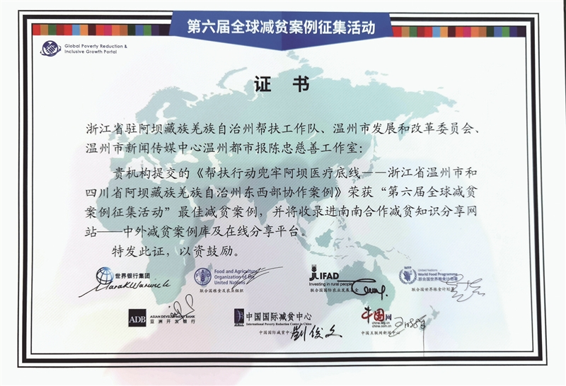 温州网讯 12月10日,2025全球减贫伙伴研讨会在北京举办。会上发布了第六届“全球减贫案例征集活动”108个推荐案例名单,《帮扶行动兜牢阿坝医疗底线——浙江省温州市和四川省阿坝藏族羌族自治州东西部协作案例》入选,荣获最佳减贫案例,并将收录进南南合作减贫知识分享网站——中外减贫案例库及在线分享平台。该案例征集活动由中国国际减贫中心、中国互联网新闻中心、世界银行、联合国粮食及农业组织、联合国世界粮食计划署、国际农业发展基金和亚洲开发银行等七家机构联合发起。