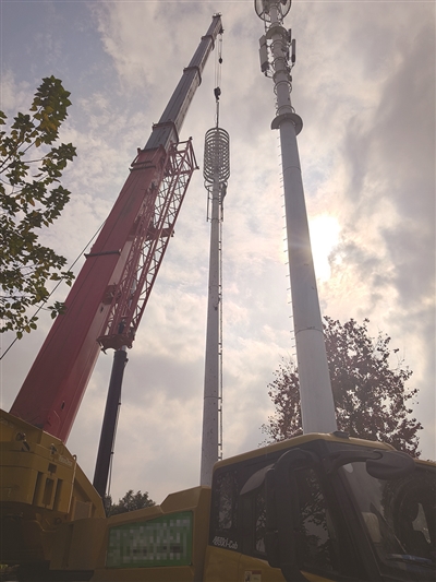 施工人员正在对数十米高的铁塔进行拆除、加固及美化作业。 陈瑶 摄