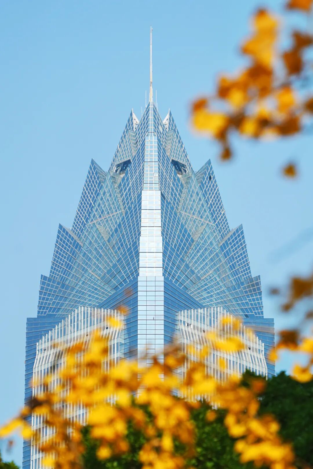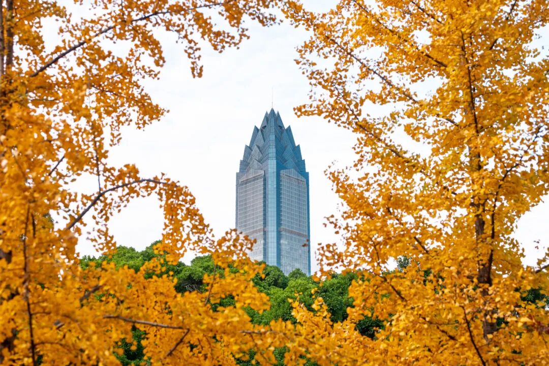 而公园最巧妙的机位,藏在面向世贸大厦的方向。那棵金色银杏的枝条,恰好为远处线条硬朗的建筑“镶”上了一幅秋日限定的流动画框。