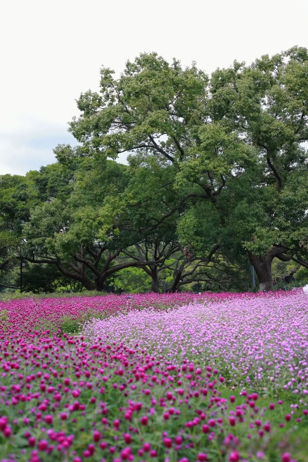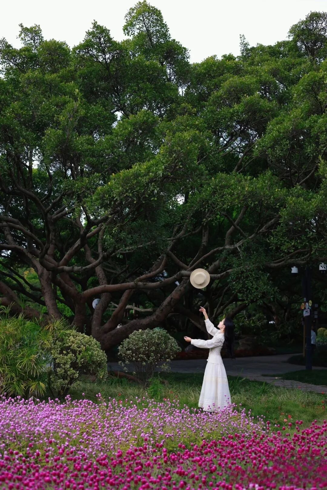 秋日的江心屿,像打翻的调色盘,色彩依然饱满。其中,最灵动的一笔莫过于棕榈草坪上那片醒目的千日红,正迎着风蓬勃盛放。