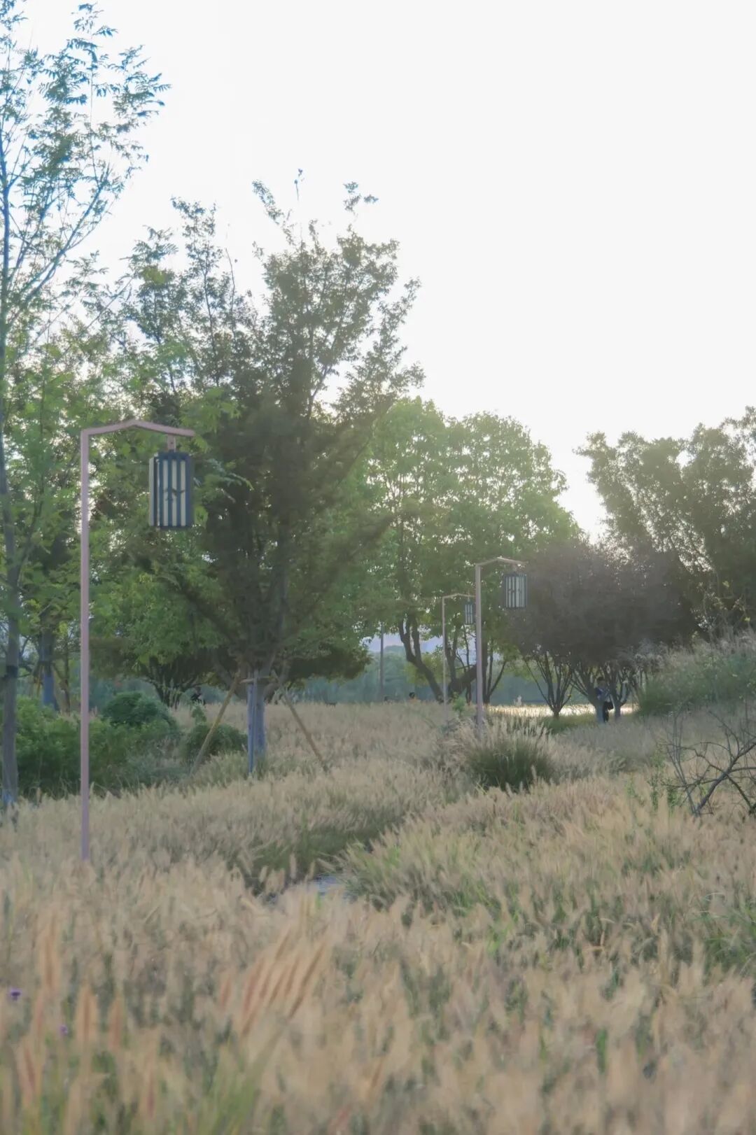 成片紫红的花穗摇曳如烟霞,在绿意浓郁的草坪与乔木掩映下,晕染出温柔的层次。