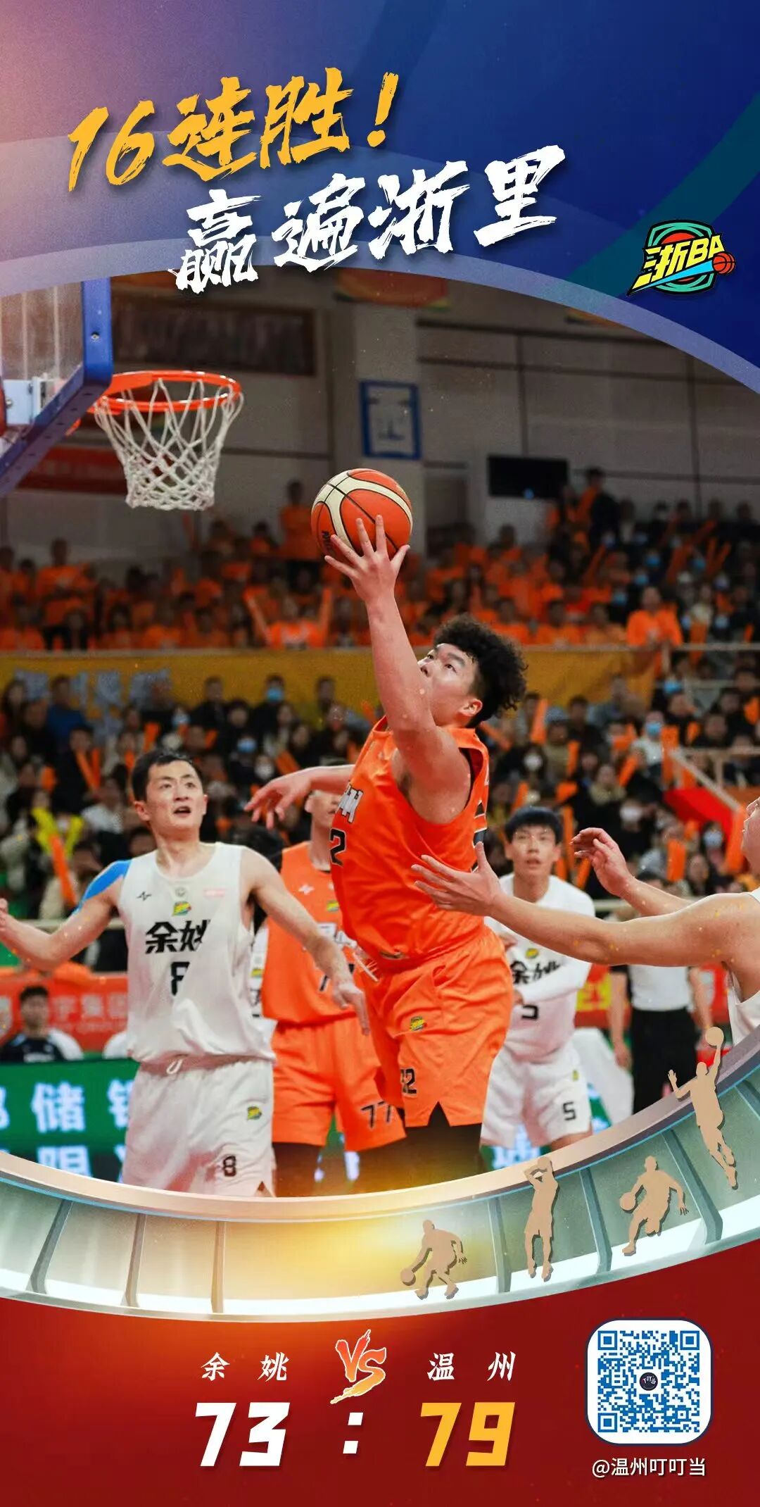 温州网讯 12月13日晚,“浙BA”城市争霸赛小组赛第18轮,A组温州队在客场对阵余姚队的比赛中,依然展现出强大实力,以79∶73再胜余姚队,战绩来到16胜0负,继续保持不败金身高居A组积分榜榜首。