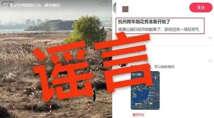 近日,网传“12月31日余杭南湖将举办跨年烟花秀”,帖文称“杭州跨年烟花秀准备开始了 南湖公园已经开始割草了,即将迎来一场狂欢”。经核实,此为不实信息,请广大市民朋友对未经核实的信息不信谣、不传谣。