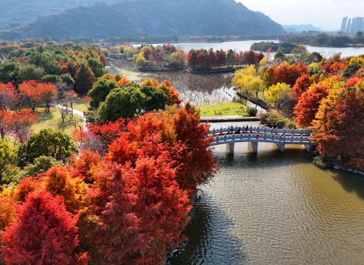 冬日,乐清市清和湿地公园层林尽染、色彩斑斓,与蓝天、碧水、城市等相映成景,宛如一幅美丽的油彩画,成为市民休闲游玩的好去处。蔡宽元 摄